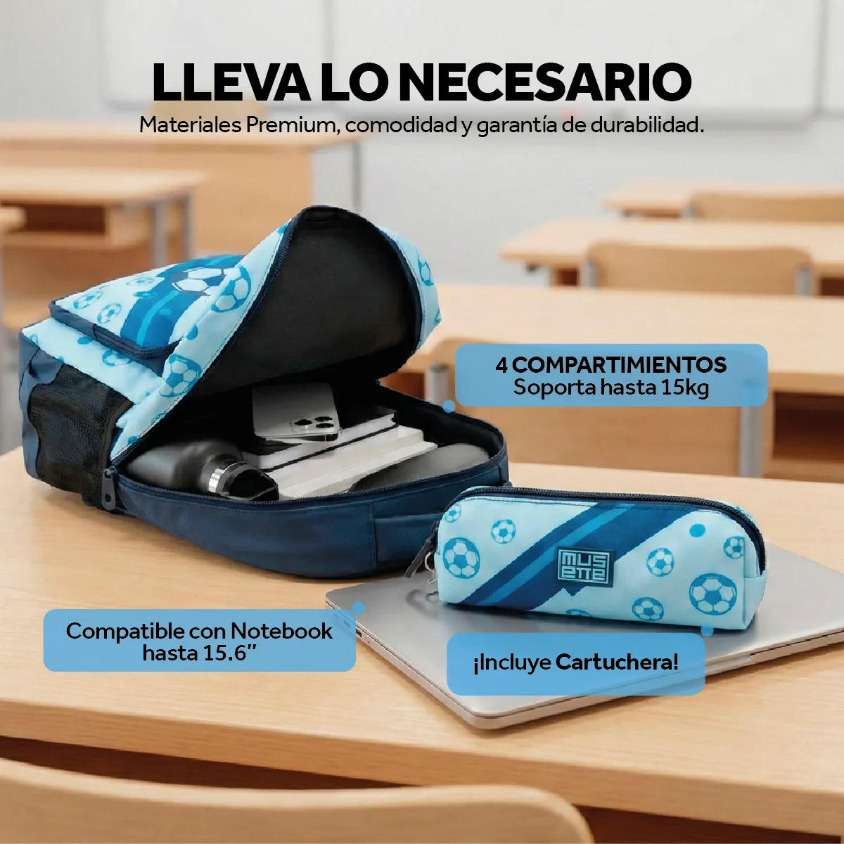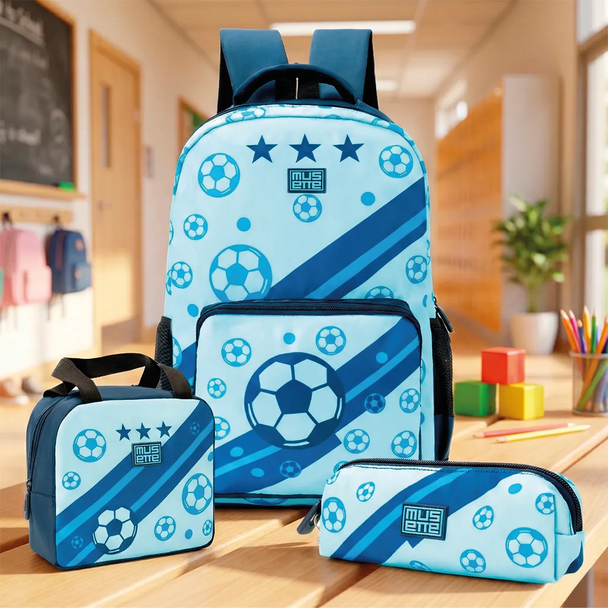 Este conjunto de mochila, lunchera y cartuchera combina un diseño divertido de fútbol en color azul con la funcionalidad y durabilidad necesaria para el día a día.