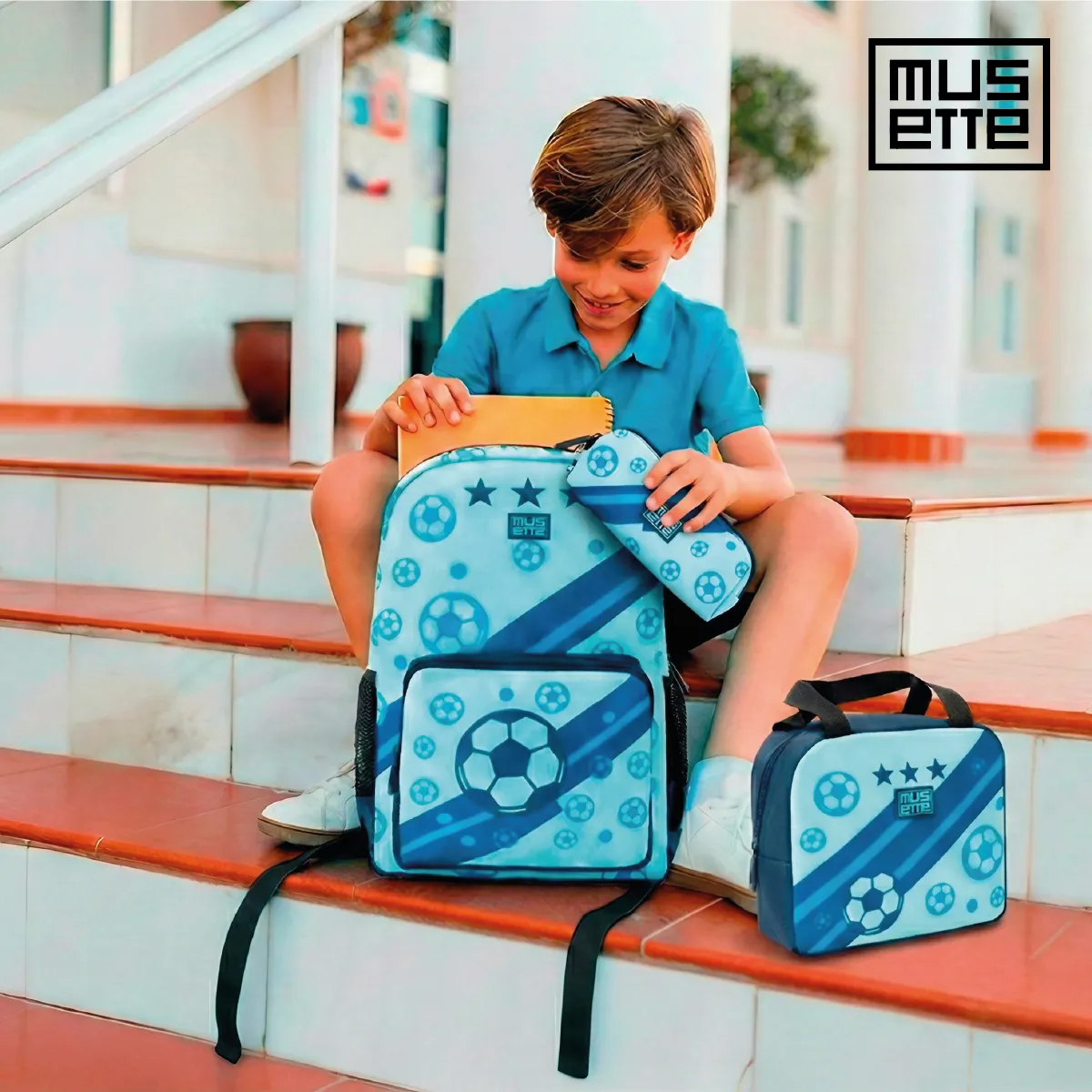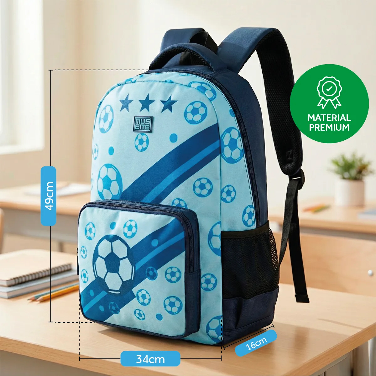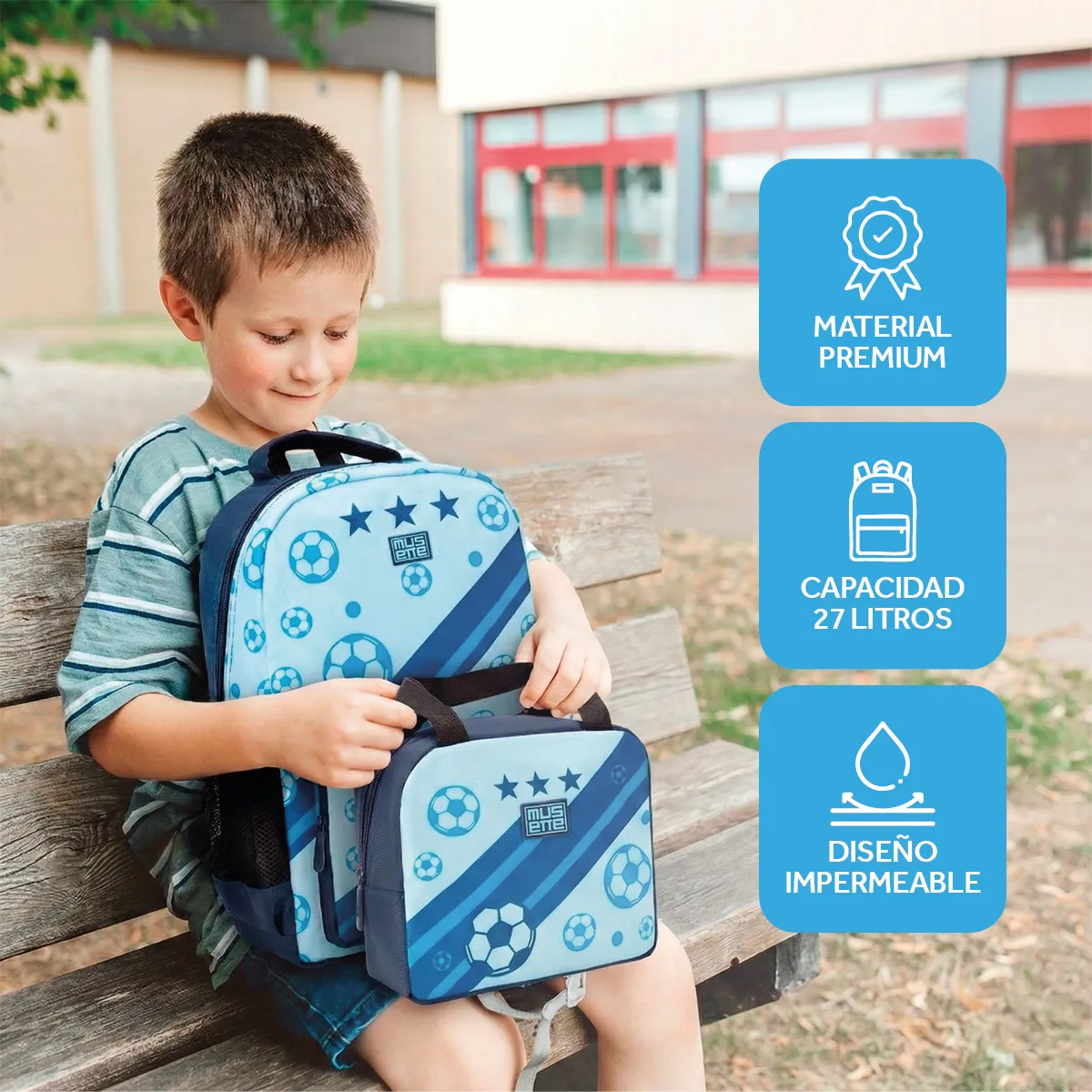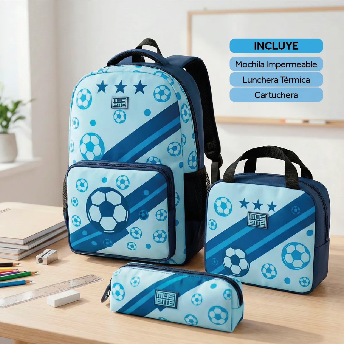 Mochila escolar premium 3 en 1 + Lunchera térmica + Cartuchera impermeable – Fútbol