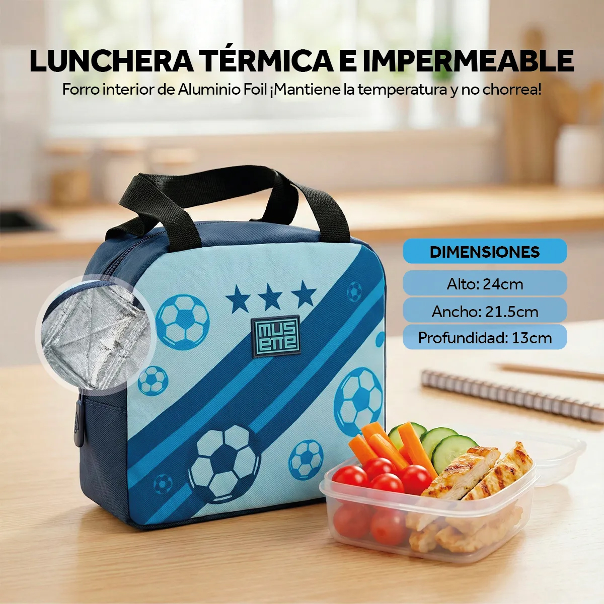 - Forro interior de Aluminio foil, ideal para mantener la temperatura