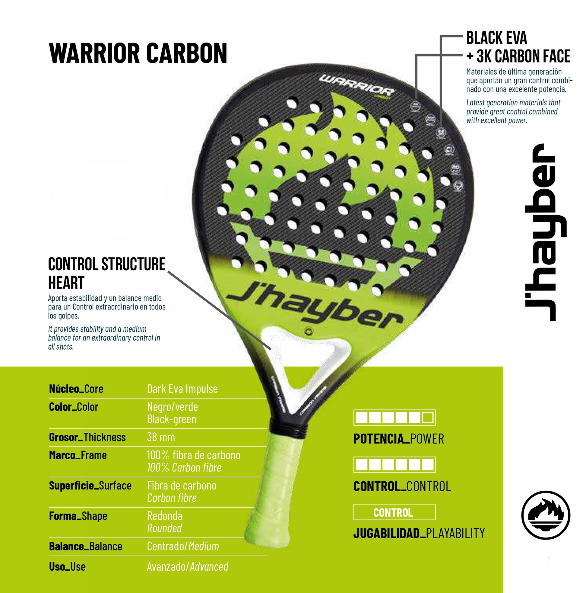 En cuanto a su composición, la Warrior Carbon tiene su marco y sus caras fabricadas con fibra de carbono (3K Carbon Face). En cuanto a su núcleo presenta goma Black EVA. En el corazón de la pala tenemos el Control Structure Heart, lo que aporta una mayor estabilidad y un balance ideal para tu juego.
