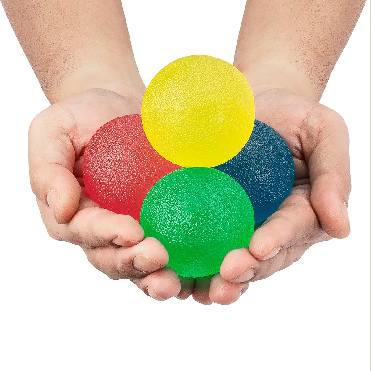 Juego de pelotas diseñadas para trabajar la fuerza de agarre y mejorar la movilidad de manos y dedos. Ideales para ejercicios de fortalecimiento progresivo, recuperación muscular y estimulación funcional.