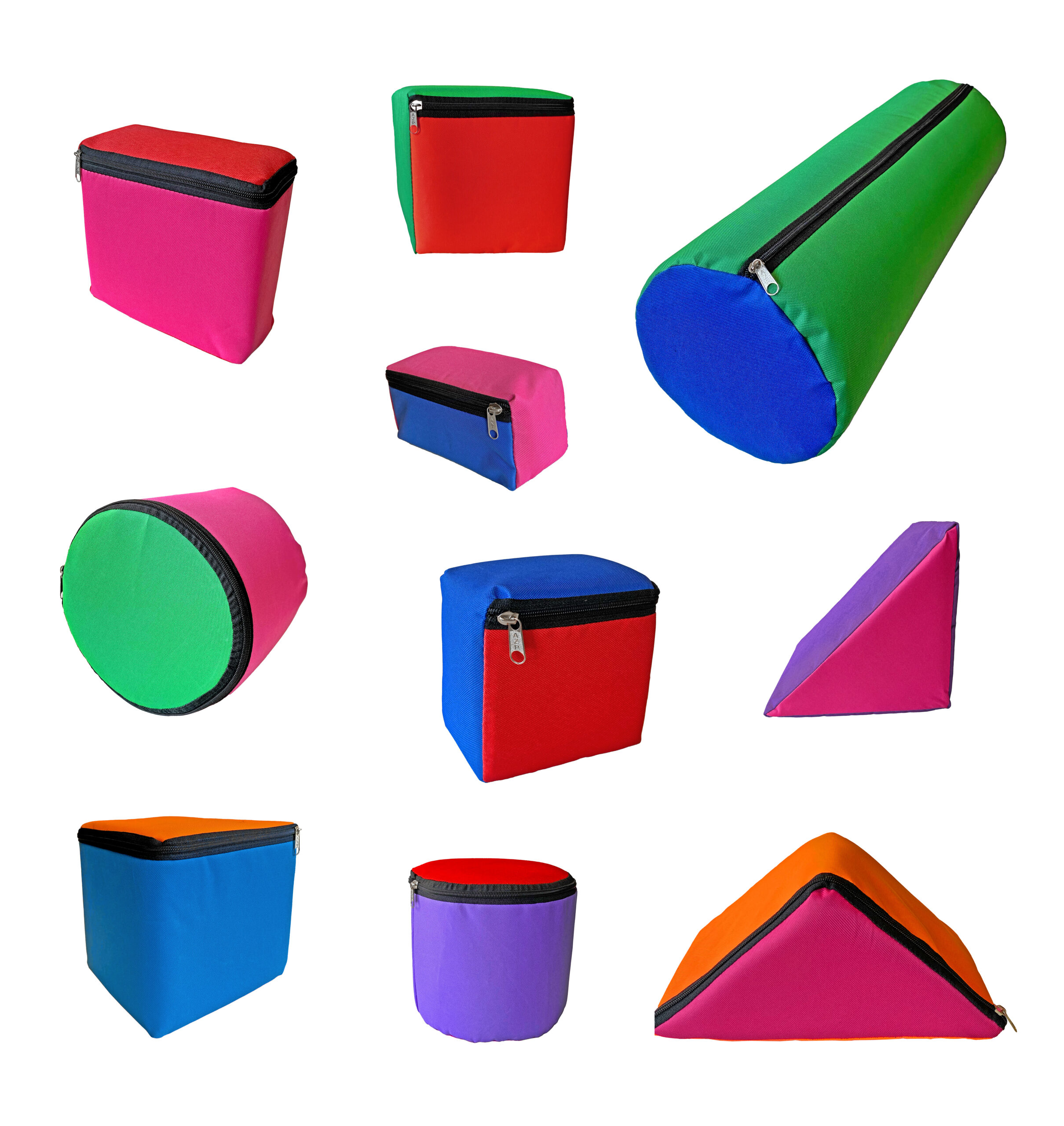 Conjunto de diez figuras geométricas, ideales para la construcción en el juego simbólico. Realizadas en goma espuma, con tela cordura y de diferentes colores que harán que el aprendizaje de colores y formas geométricas sea un juego para los más pequeños. El cilindro 60 x 20 es propio para inicios de rehabilitación ante problemas sensoriomotores detectados por el educador.