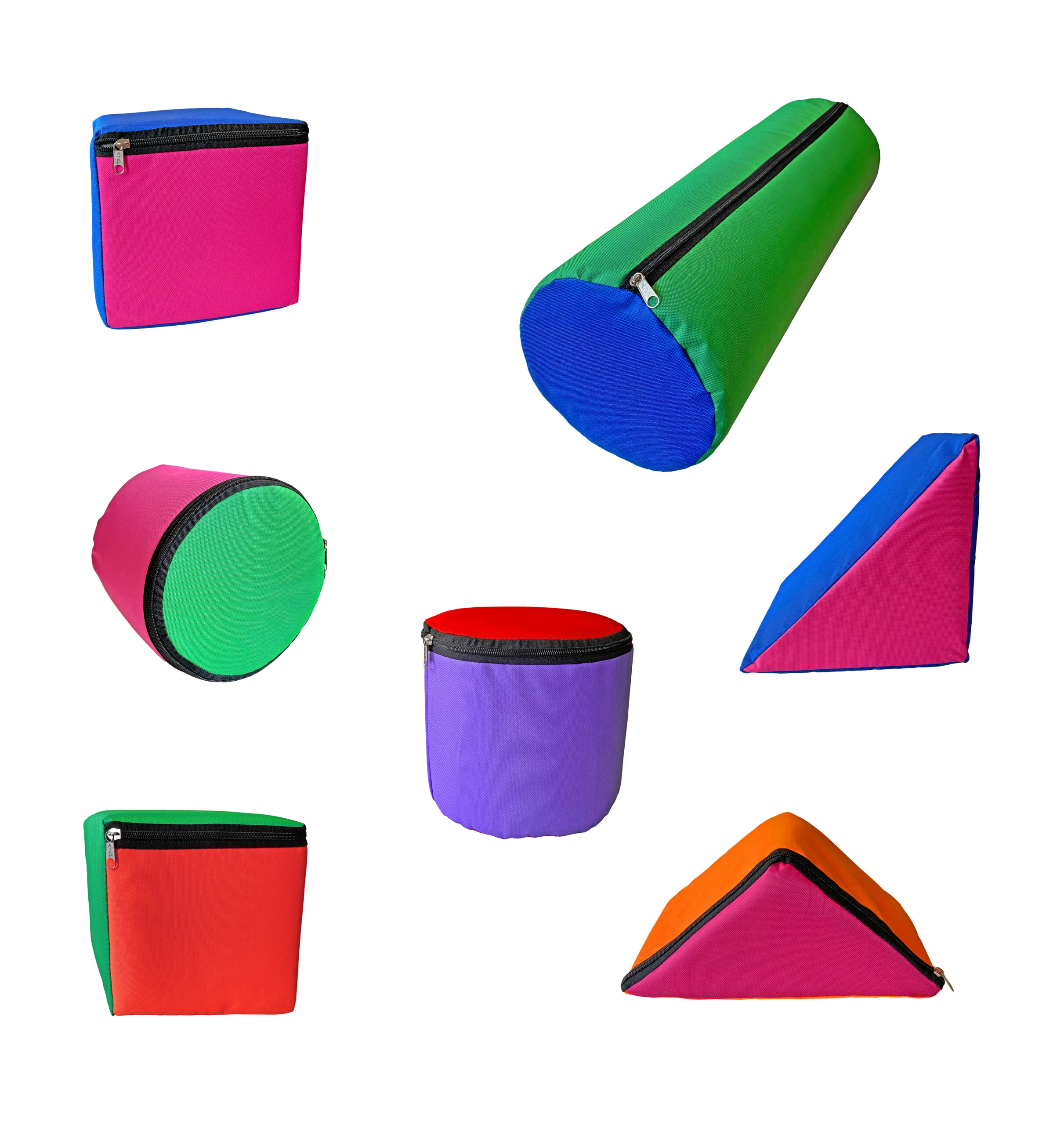 Conjunto de 7 elementos geométricos rellenos de goma espuma. Sus distintas medidas permitirán al niño efectuar juegos de comparación (tamaños, formas, medidas) a la vez que mejorará la coordinación general mediante el transporte de piezas. El cilindro 60 x 20 es propio para inicios de rehabilitación ante problemas sensoriomotores detectados por el educador.